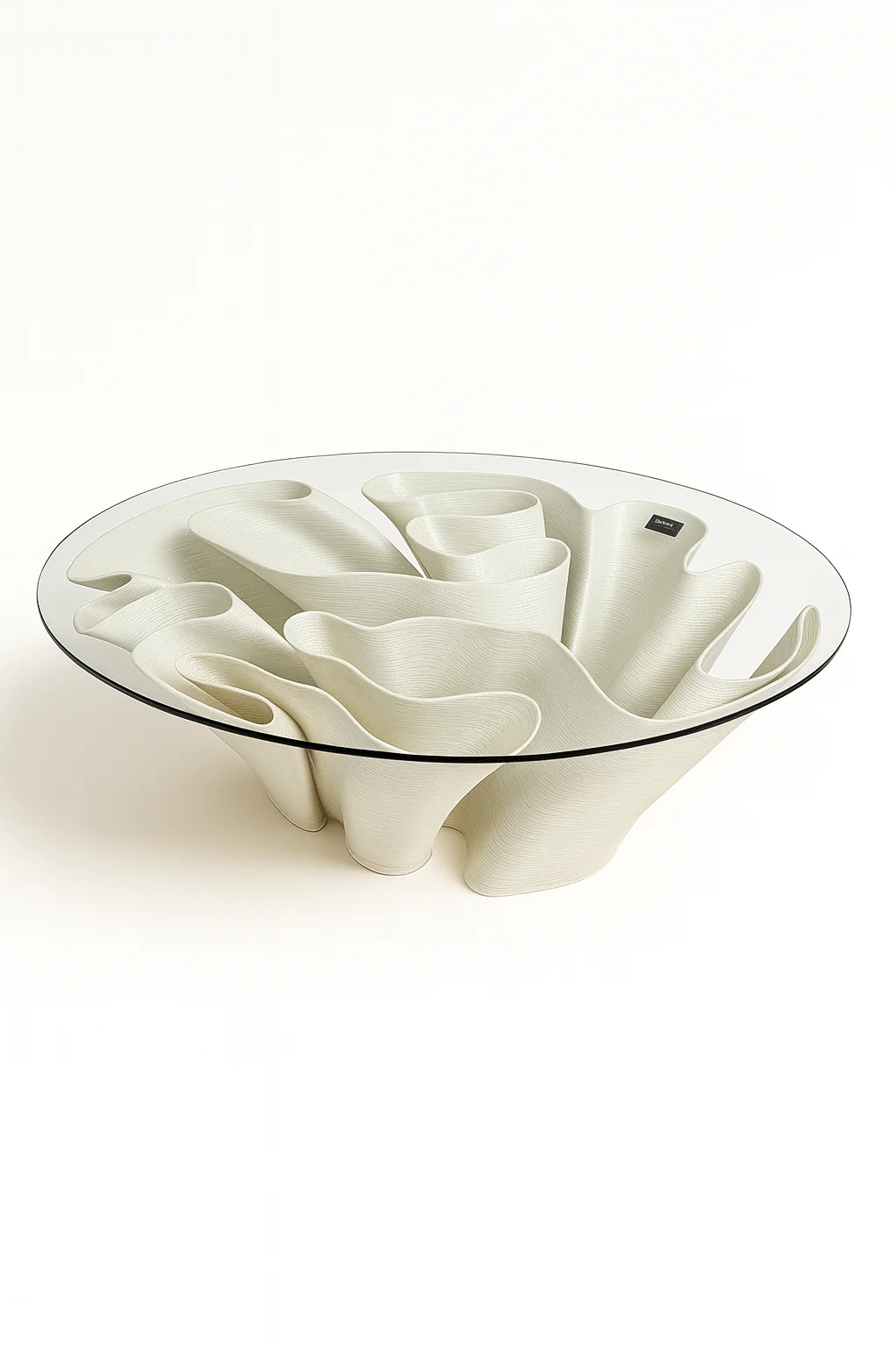 Mesa baja impresa en 3D con base orgánica y estructura ligera pero resistente. Personalizable en medidas, acabados y materiales sostenibles, incorpora una tapa de cristal de 10 mm —con opción de vidrio templado— que resalta su silueta inspirada en las mareas. Su diseño fluido y su mantenimiento sencillo la convierten en una pieza elegante y versátil para cualquier espacio.