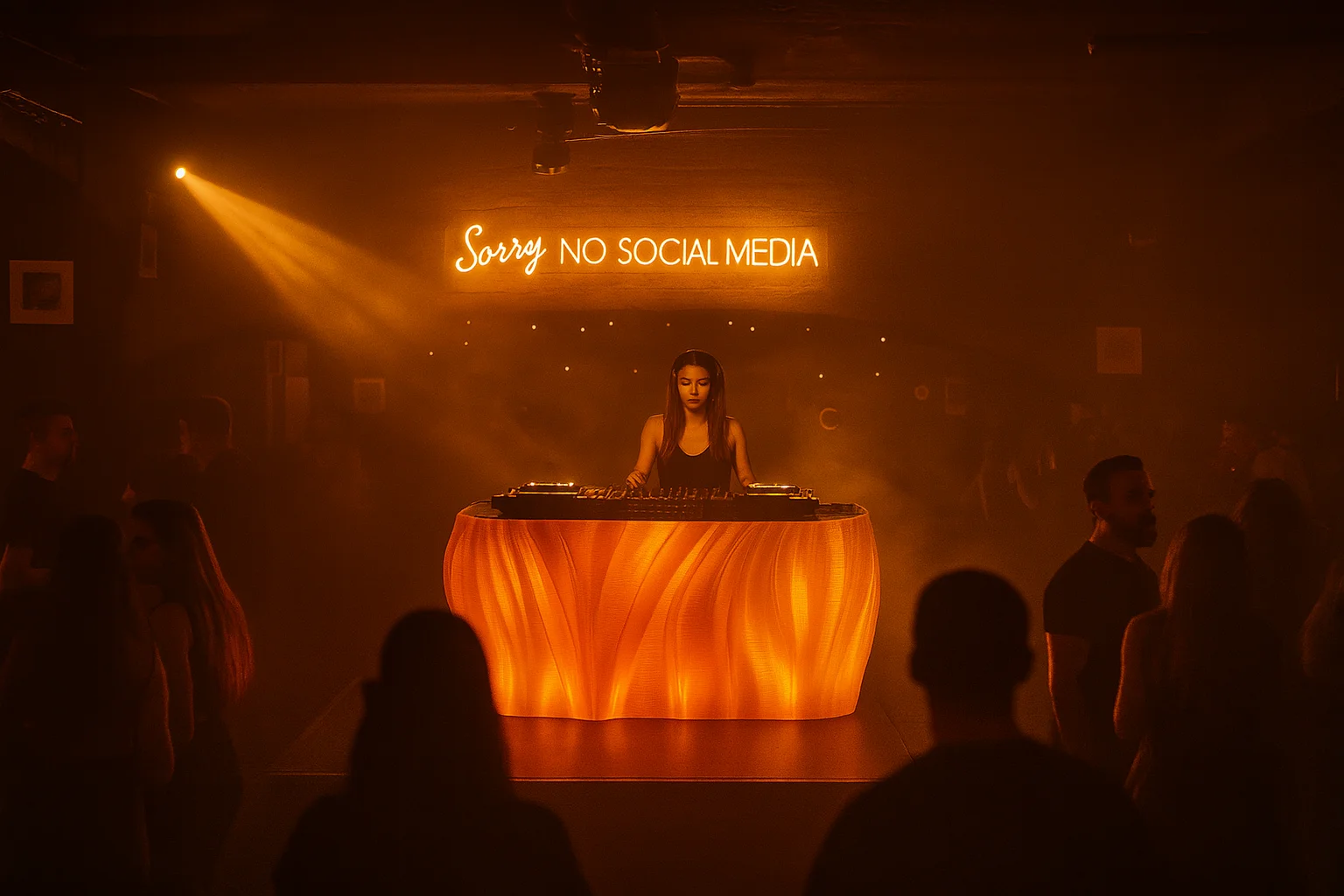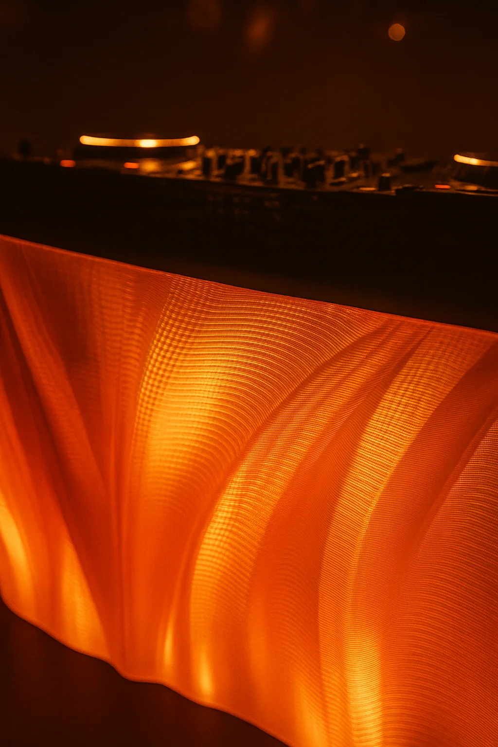 Mesa DJ impresa en 3D con un diseño ligero, resistente y totalmente personalizable. Su contorno semi-rectangular de bordes abombados aporta una estética fluida inspirada en el entorno marino. El interior laminado incluye huecos configurables para equipos y cableado, adaptándose a las necesidades del usuario.