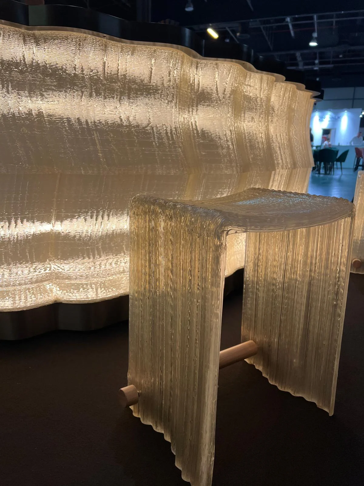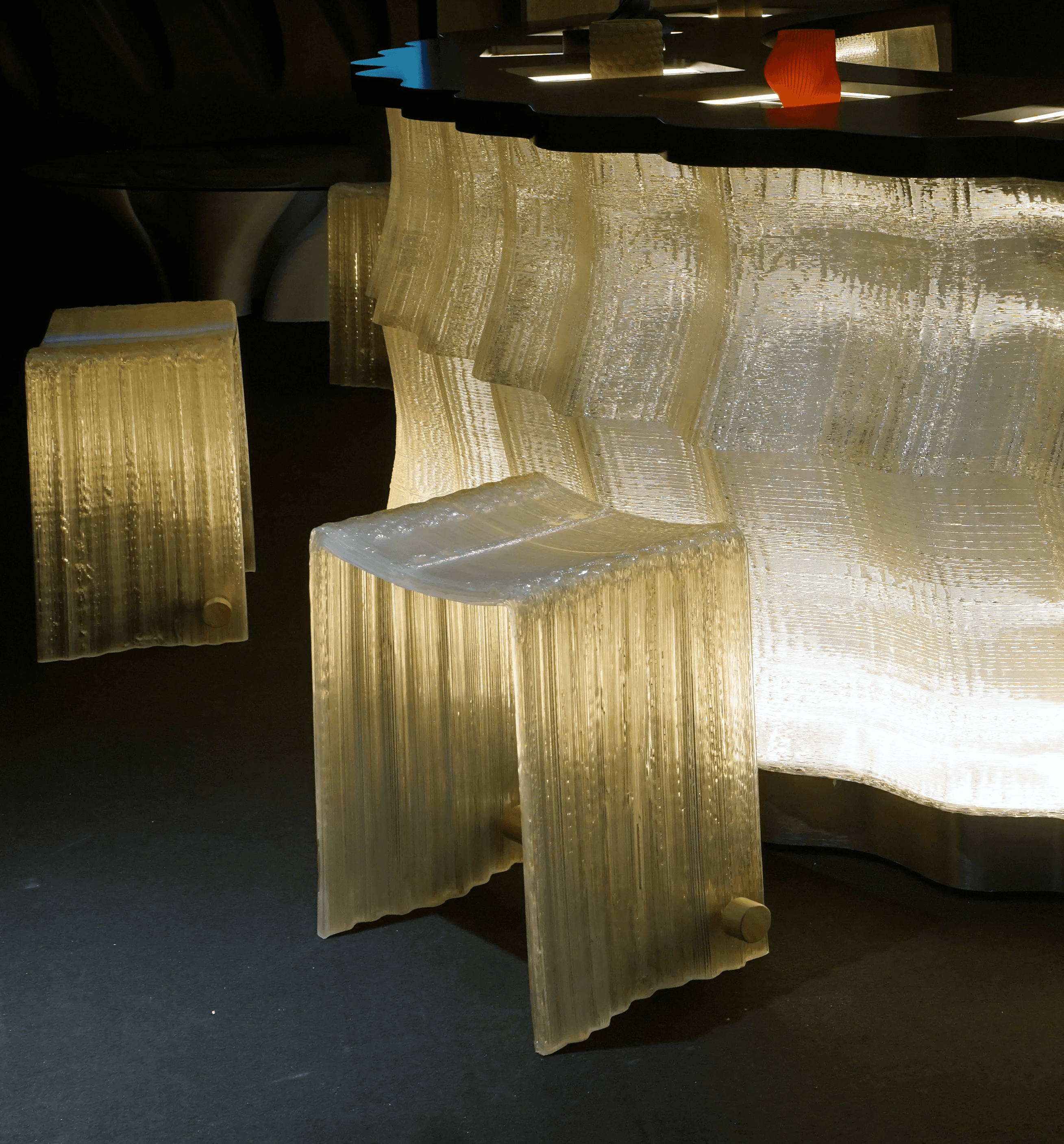 Taburete impreso en 3D con estructura ligera, resistente y personalizable en medidas, acabados y materiales sostenibles. Su diseño orgánico se complementa con un apoyapiés de madera de roble, aportando calidez y durabilidad.