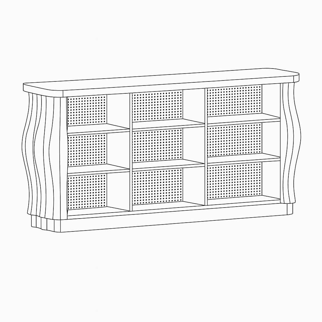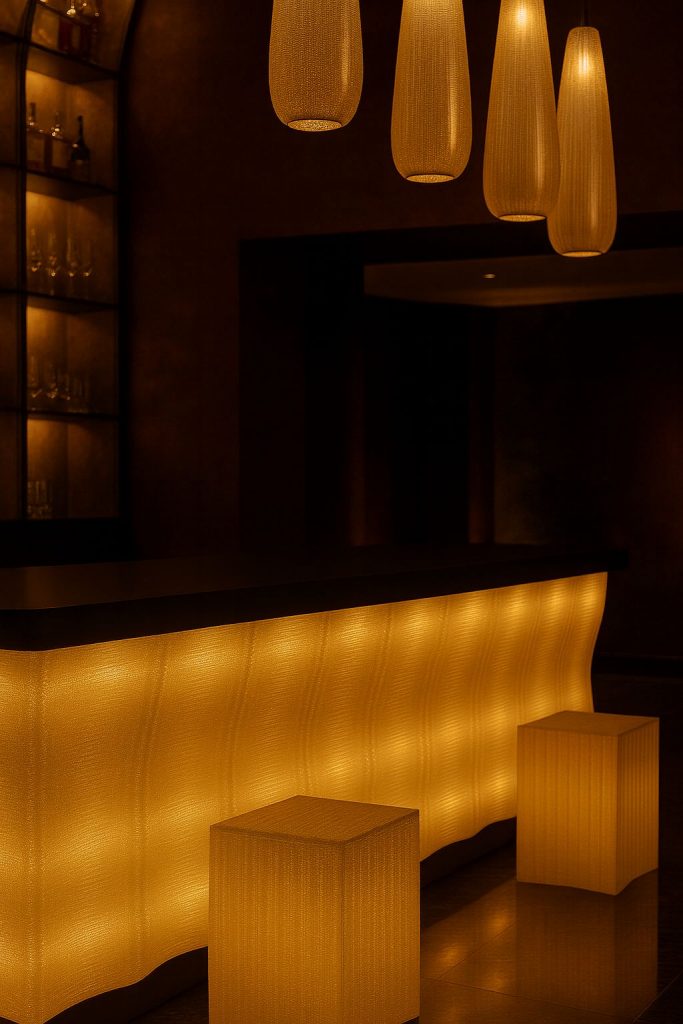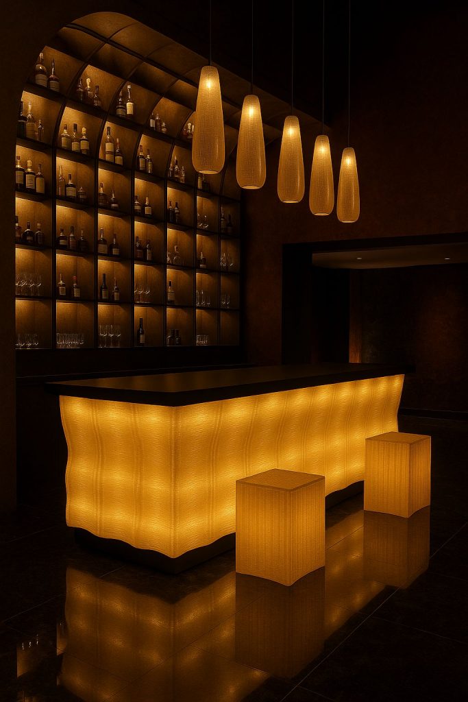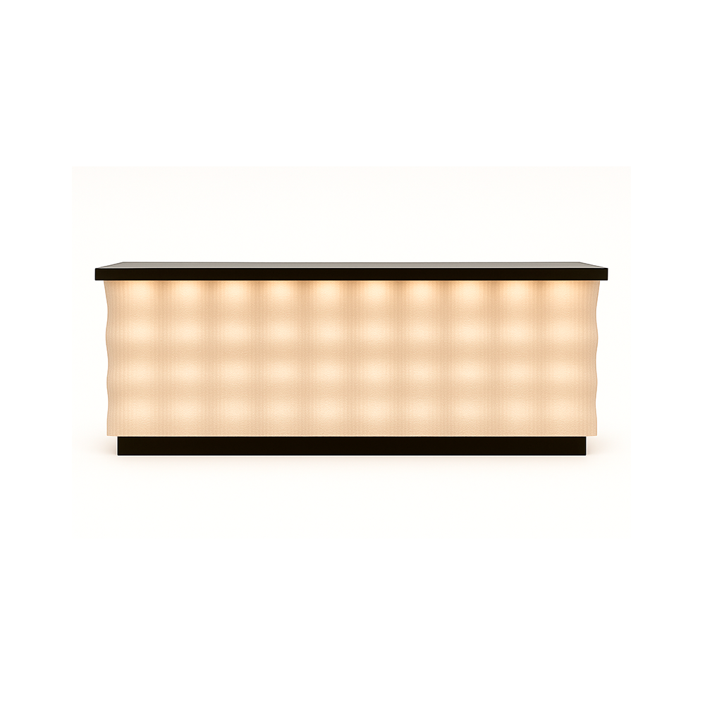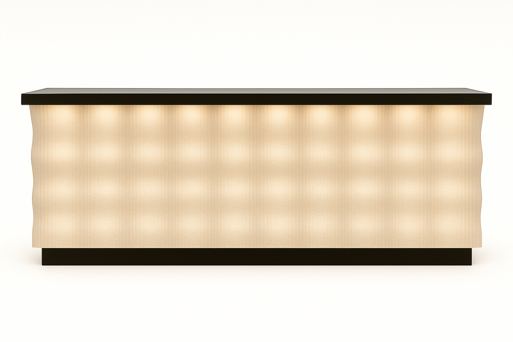 Barra de contorno rectangular impresa en 3D que destaca por su estabilidad y ligereza. Personalizable en medidas, acabados y materiales sostenibles, ofrece un interior laminado con estantes configurables según las necesidades del proyecto.