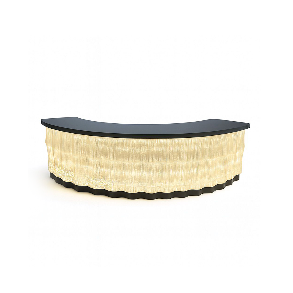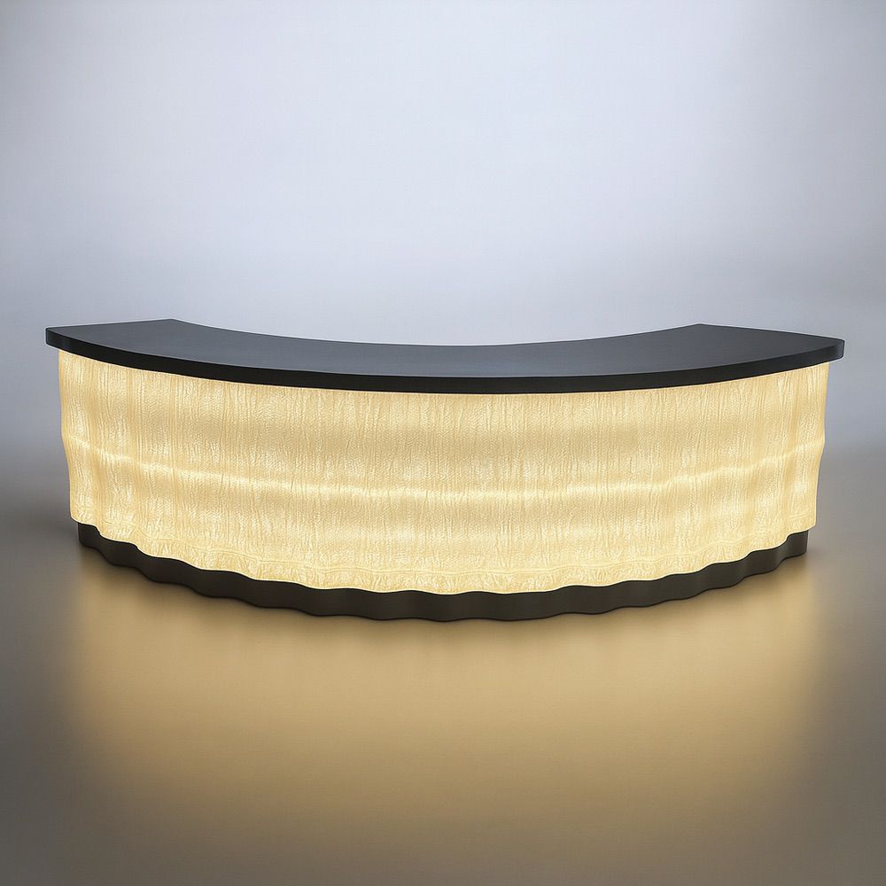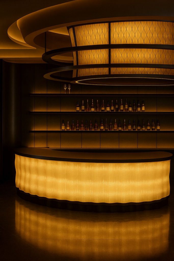 Barra de diseño curvo impresa en 3D que fusiona sostenibilidad y estética marina. Su estructura ligera y resistente, junto con la iluminación LED opcional en tonos cálidos, fríos o RGB, crea un ambiente envolvente y vanguardista.