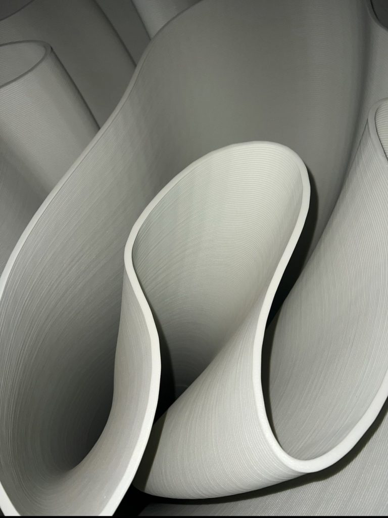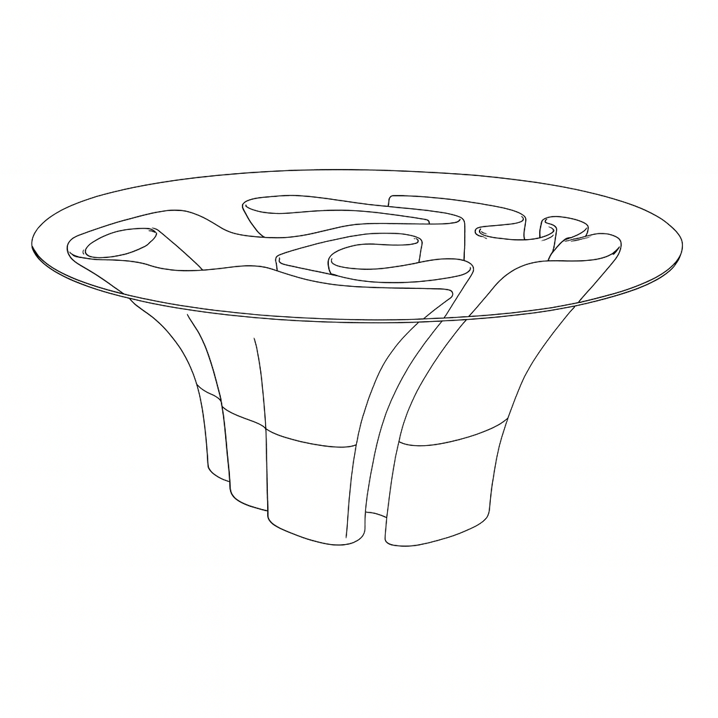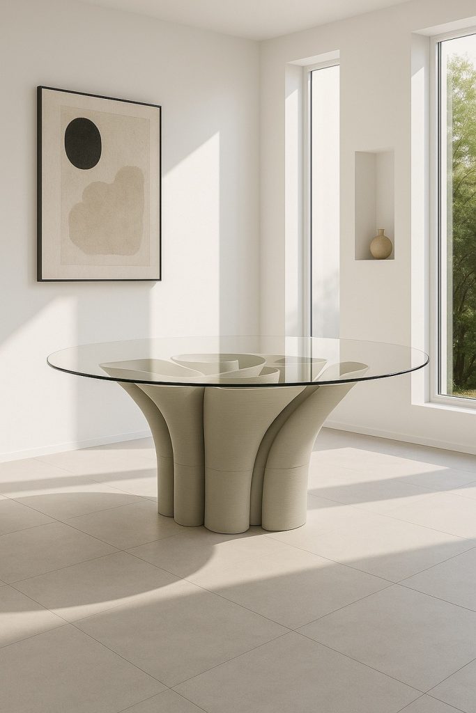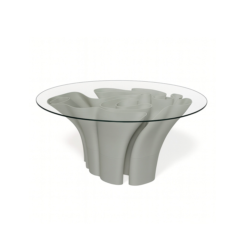 Mesa alta impresa en 3D con base orgánica y sólida, diseñada para aportar carácter y fluidez a cualquier espacio.