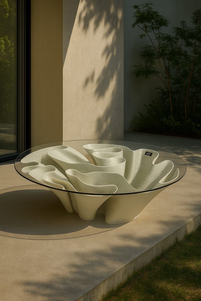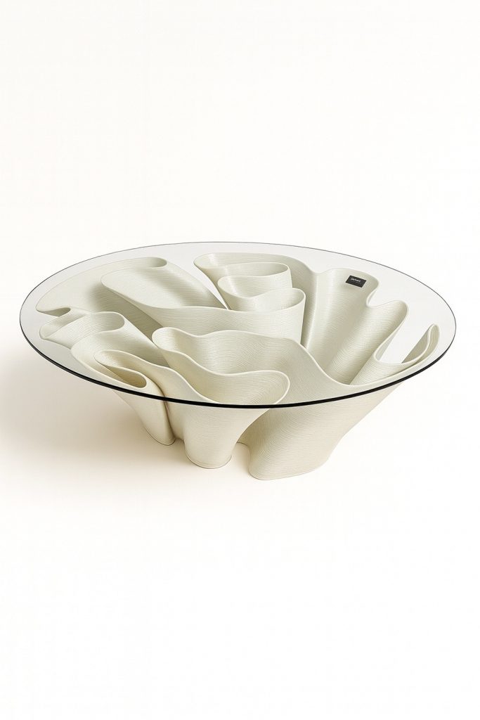 Mesa baja impresa en 3D con base orgánica y estructura ligera pero resistente. Personalizable en medidas, acabados y materiales sostenibles, incorpora una tapa de cristal de 10 mm —con opción de vidrio templado— que resalta su silueta inspirada en las mareas. Su diseño fluido y su mantenimiento sencillo la convierten en una pieza elegante y versátil para cualquier espacio.