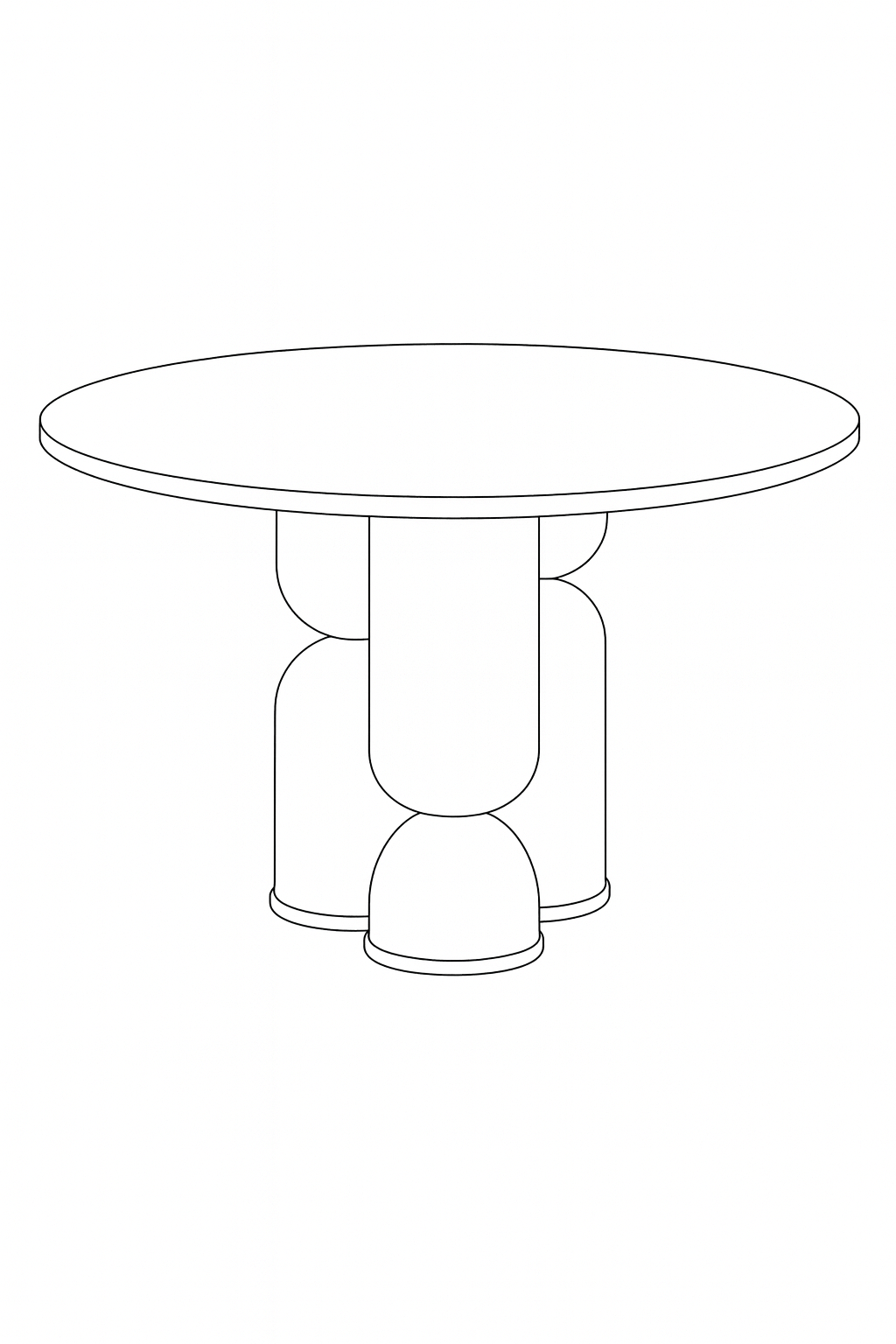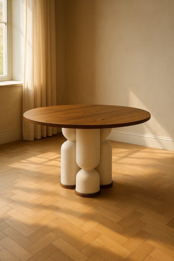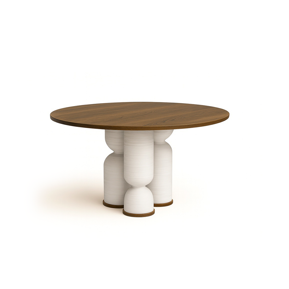 Mesa redonda impresa en 3D, ligera y resistente, totalmente personalizable en medidas, acabados y materiales sostenibles. Disponible con tapa en chapa de roble, laca o cristal, con opción de vidrio templado, y posibilidad de interiores en porcelánico o piedra bajo cotización.