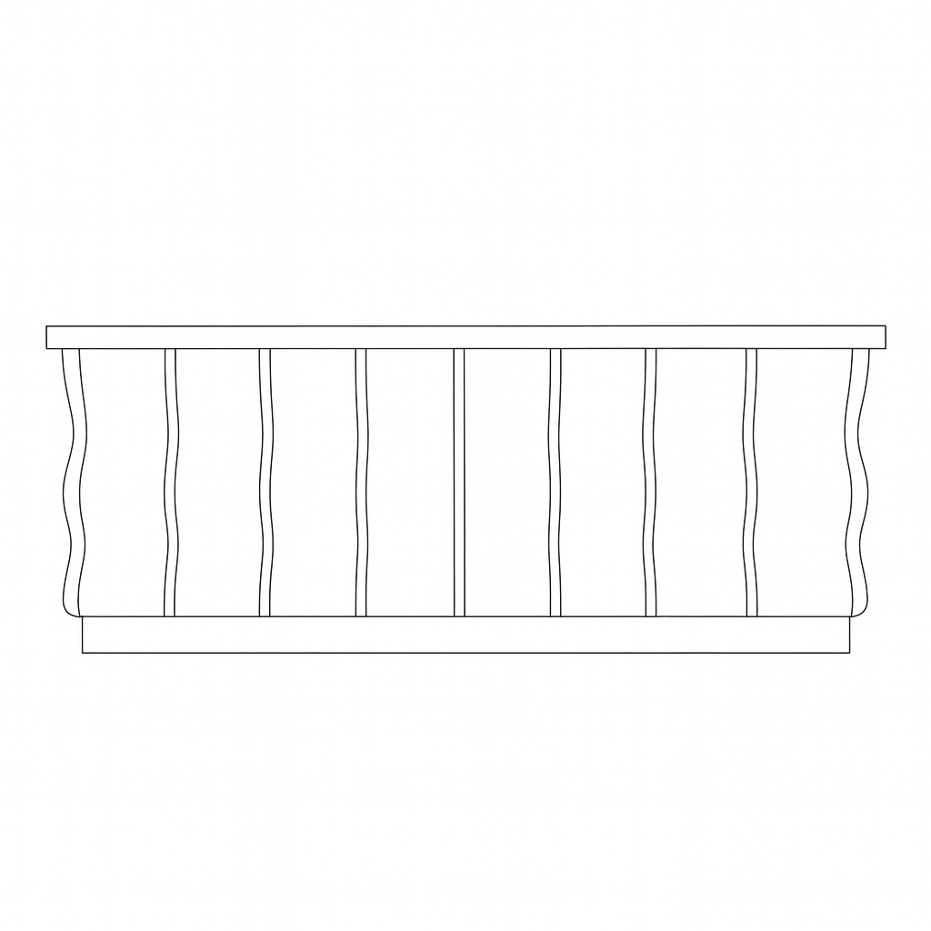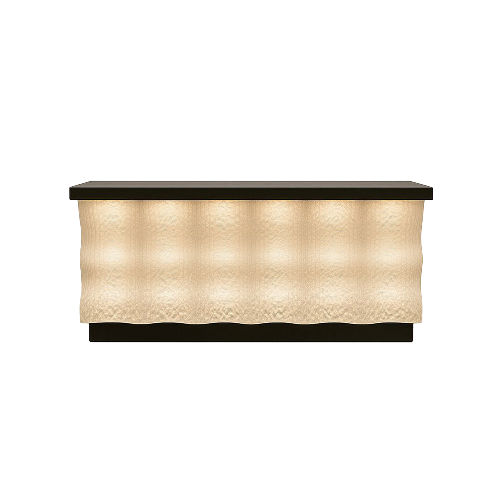 El interior laminado incluye hueco superior y divisiones configurables según las necesidades de atención al público. La iluminación LED opcional, cálida, fría o RGB, con posibilidad de zócalo iluminado, aporta un ambiente moderno y profesional. Una pieza funcional y elegante inspirada en la armonía marina.