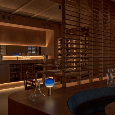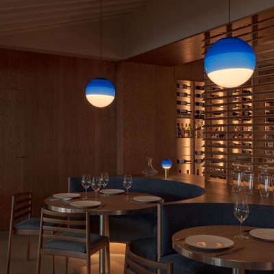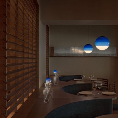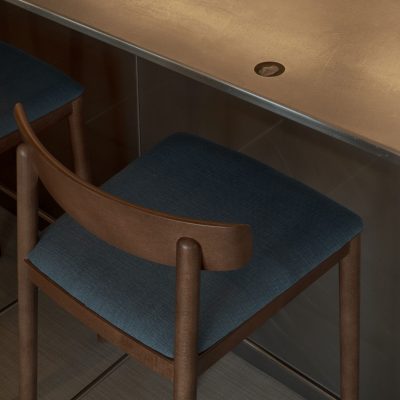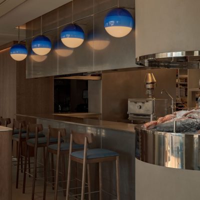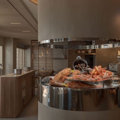 En cuanto a las texturas, nos enfocamos en que estas mismas evocarán a la misma naturaleza de donde provienen los productos del negocio; el mar y arena. De esta forma, empleando materiales y mobiliario de alta calidad al igual que funcional, de marcas reconocidas como Andreu World, complementados con la iluminación de Marset, conseguimos aportar una atmósfera mediterránea y calmada. Incluso en las baldas decorativas, las cuales simulan el reflejo del mar y separadores de madera que evocan el esqueleto de un barco.