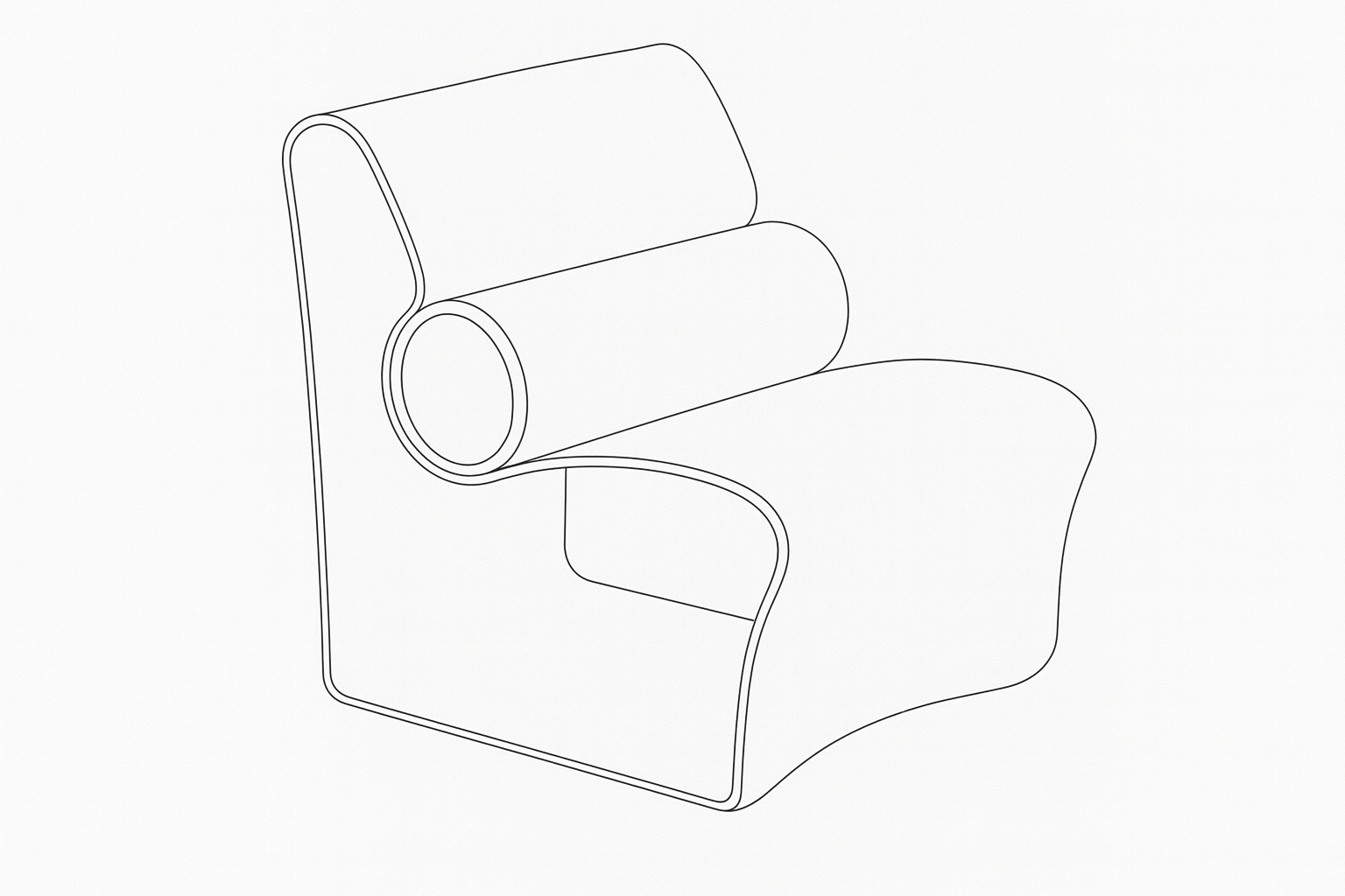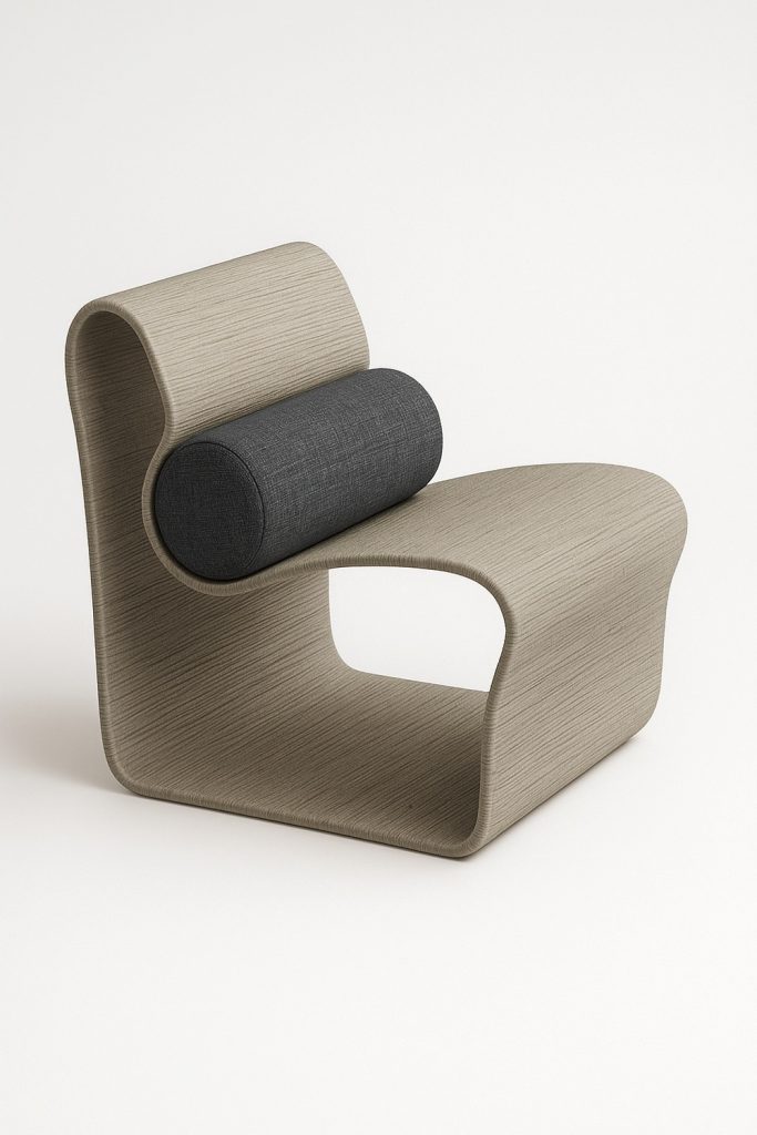 Sillón impreso en 3D con un diseño orgánico y acogedor, complementado con un cojín que aporta mayor confort. Su estructura ligera y resistente es completamente personalizable en acabados, medidas y materiales sostenibles.